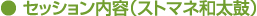のストマネ和太鼓は、ストレスのメカニズムを知り、ご自身のストレス反応をモニタリングしながら、ストレスと上手に付き合うことを目指します。呼吸法や筋弛緩法、動作法などのリラクゼーションと和太鼓をコラボレーションさせた活動です。